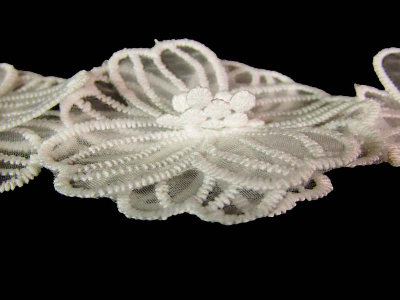Ozdobna taśma haftowanych szyfonowych kwiatów złożonych się z trzech warstw płatków.  Kwiaty można bardzo łatwo ciąć na pojedyncze sztuki.