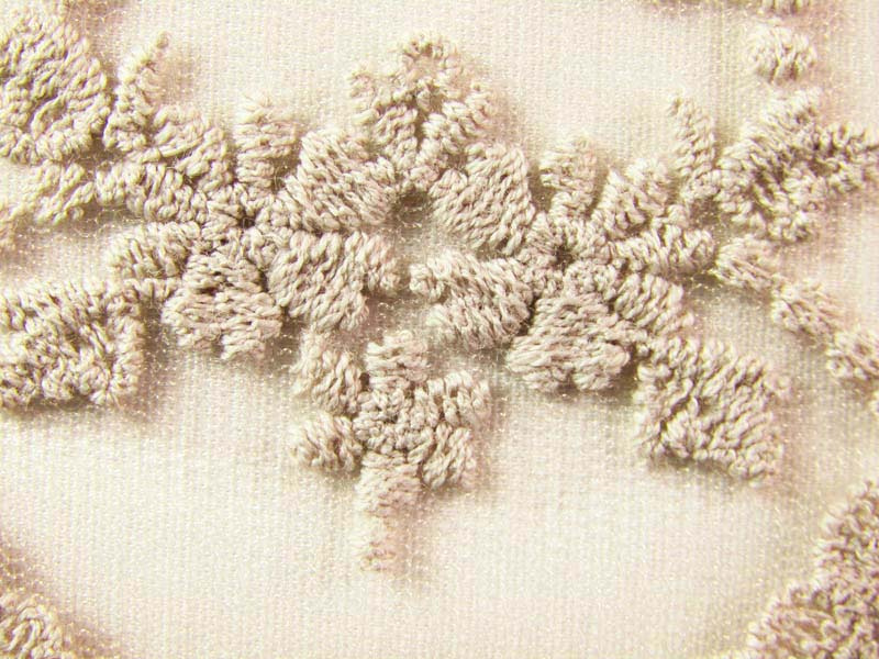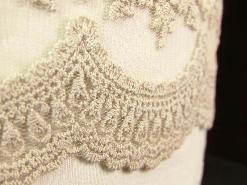 Koronka tiulowa o szerokości 7,5m z kwiatowym wzorem, wykończona dwustronnie. Koronka haftowana matową, bawełnianą przędzą.