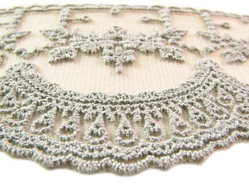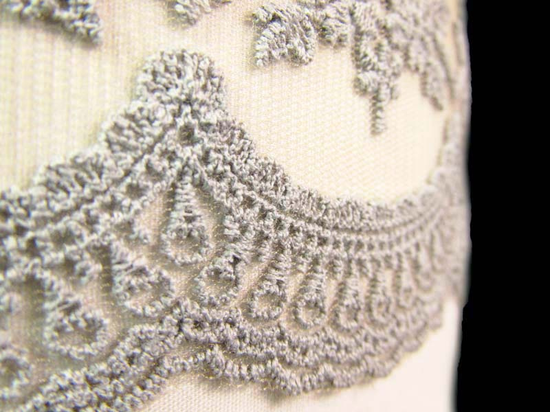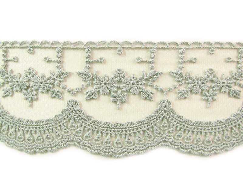 Koronka tiulowa o szerokości 7,5m z kwiatowym wzorem, wykończona dwustronnie. Koronka haftowana matową, bawełnianą przędzą.