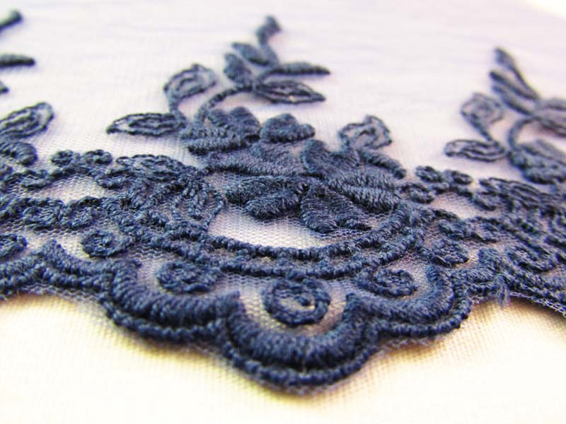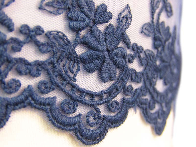 Koronka tiulowa o szerokości 9cm z kwiatowym wzorem, wykończona jednostronnie. Koronka haftowana matową, bawełnianą przędzą.