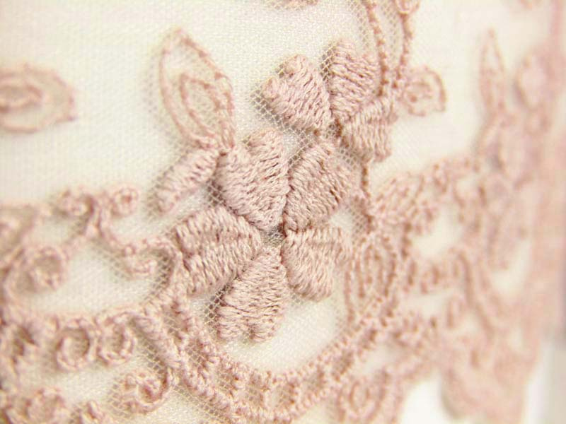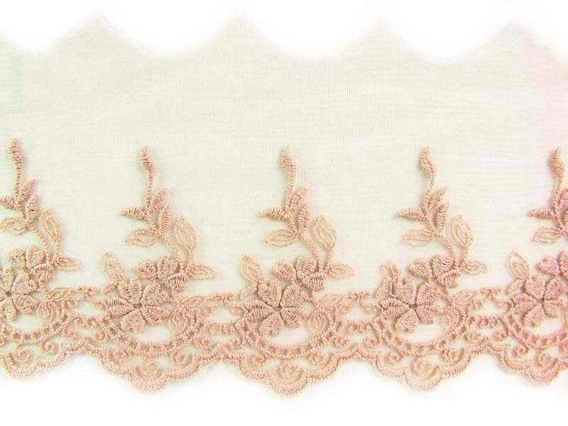 Koronka tiulowa o szerokości 9cm z kwiatowym wzorem, wykończona jednostronnie. Koronka haftowana matową, bawełnianą przędzą.