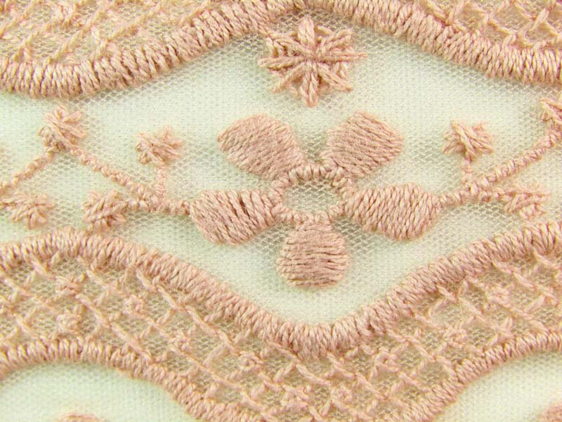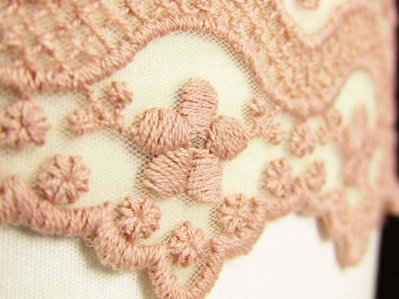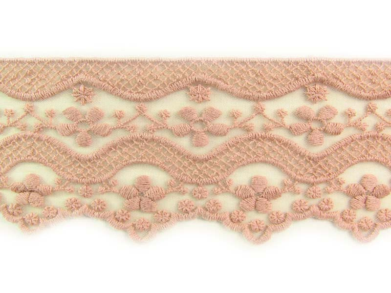 Koronka tiulowa o szerokości 6cm z kwiatowym wzorem, wykończona dwustronnie. Koronka haftowana matową, bawełnianą przędzą.