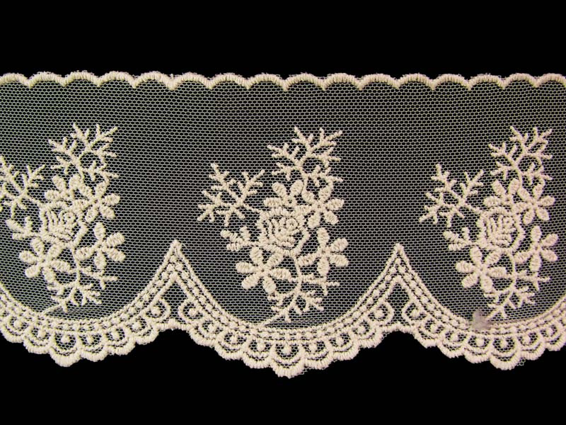 Koronka tiulowa o szerokości 7,5cm z delikatnym kwiatowym wzorem, obustronnie wykończona.  Koronka haftowana matową przędzą.
