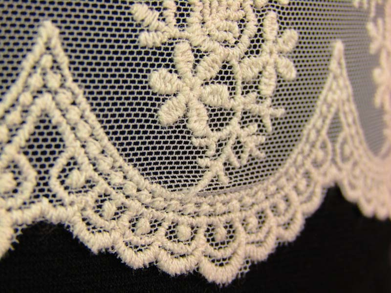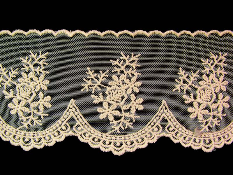 Koronka tiulowa o szerokości 7,5cm z delikatnym kwiatowym wzorem, obustronnie wykończona. Koronka haftowana matową przędzą.