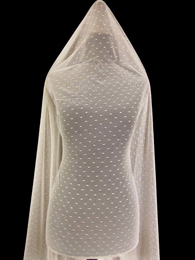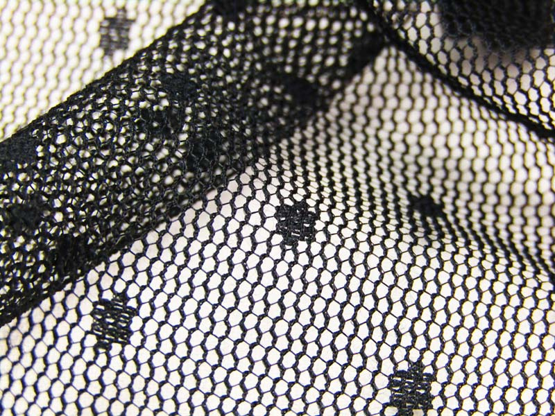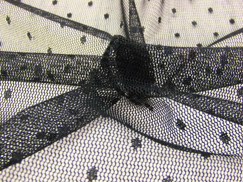 - Miękki i lejący tiul o wzorze kropek wrobionych w strukturę tkaniny.