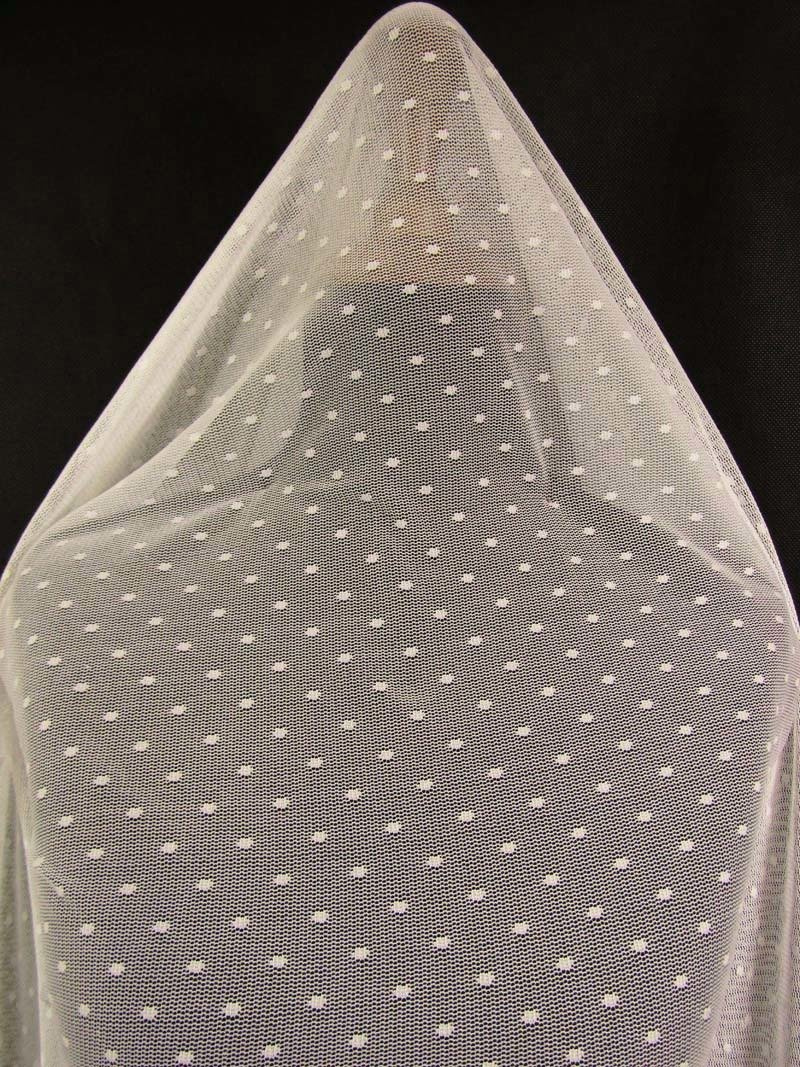 Miękki i lejący tiul o wzorze kropek wrobionych w strukturę tkaniny.