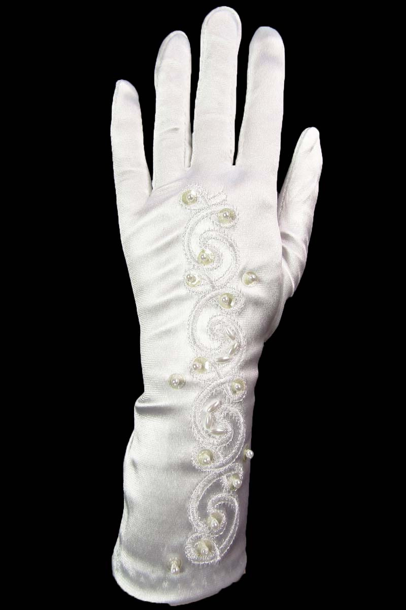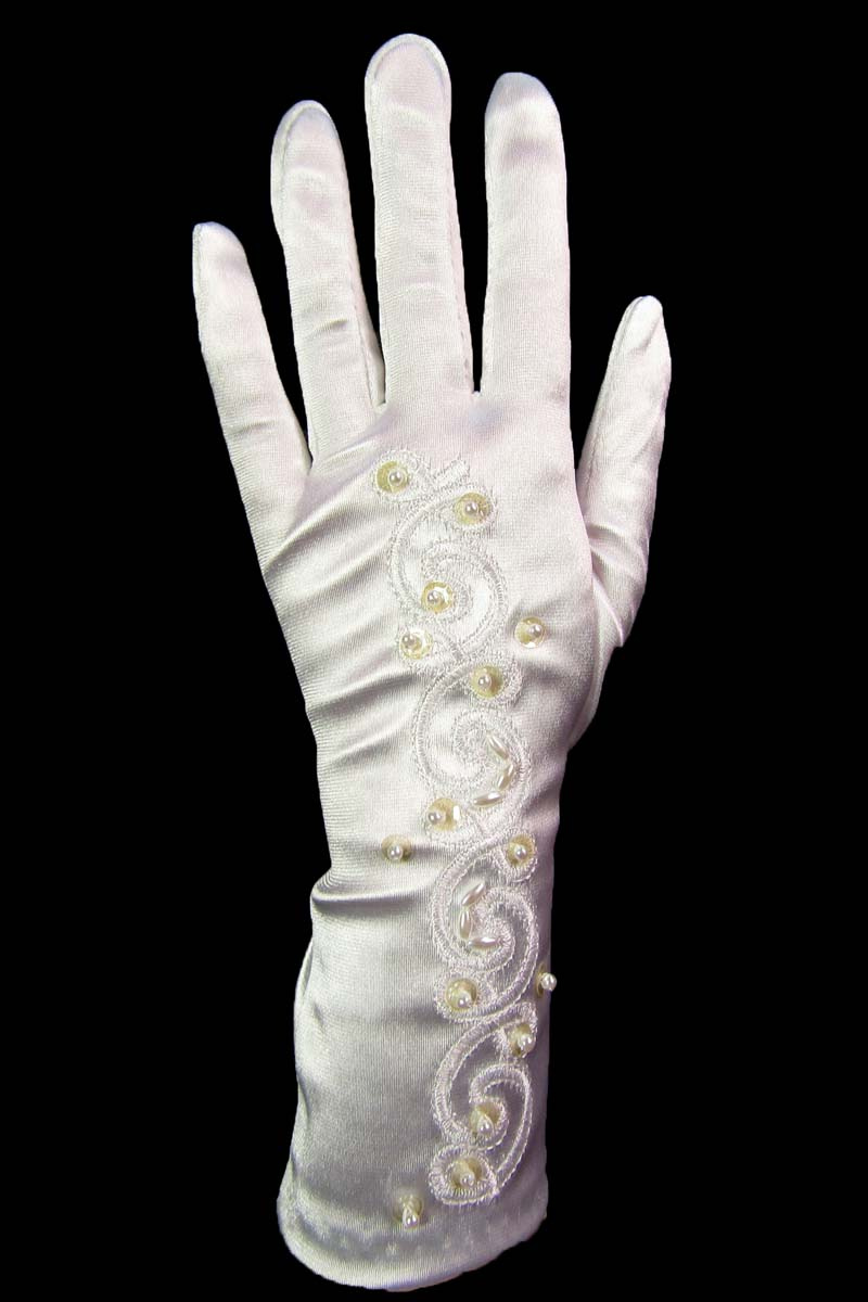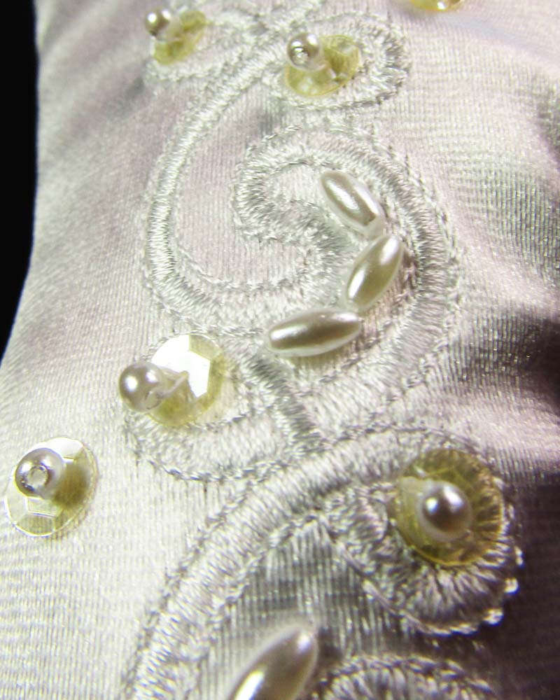 Gładka rękawiczka wykonana z elastycznej, błyszczącej satyny. Dodatkowo ozdobiona haftem, cekinami i perełkami. Idealna jako dodatek przy wszelkiego rodzaju uroczystościach lub specjalnych okazjach. Po założeniu tkanina pracuje i dopasowuję się do dłoni.