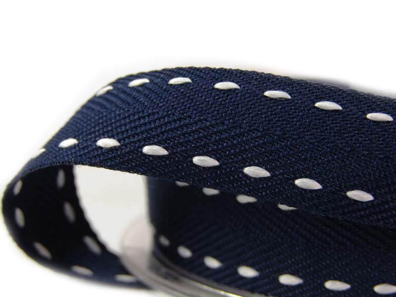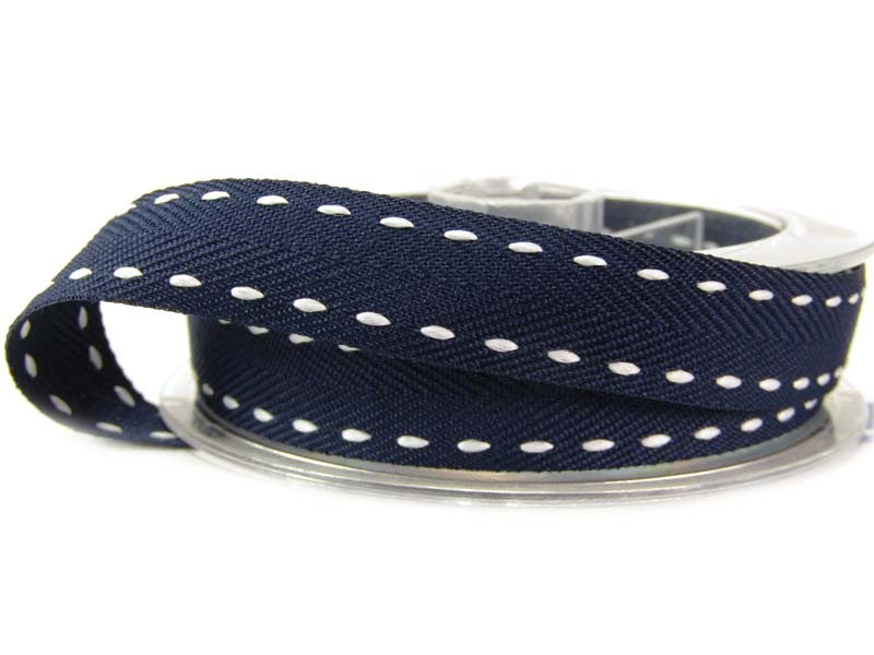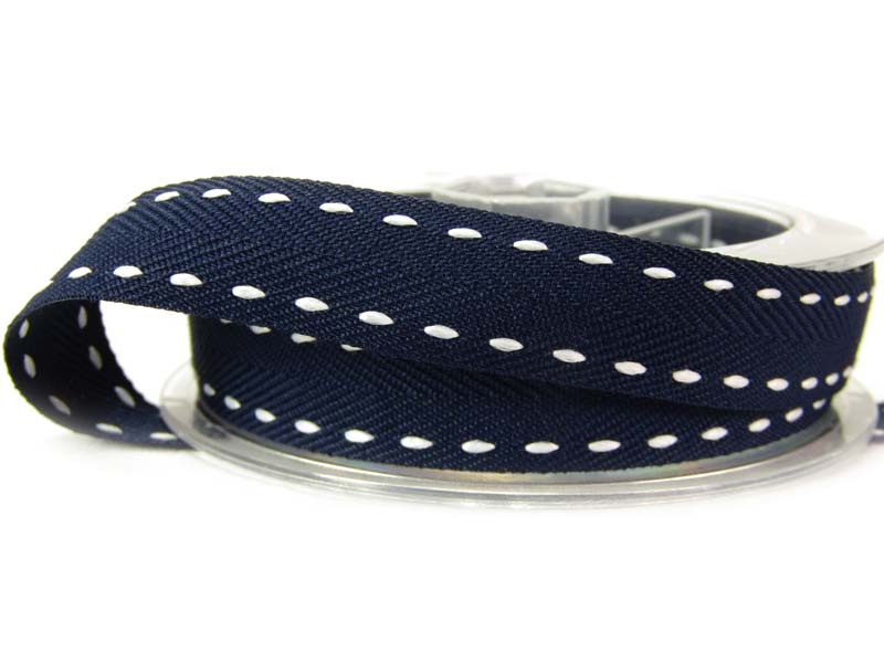 Taśma jodełkowa, stebnowana o szerokości 15mm w kolorze granatowym z białą stebnówką.