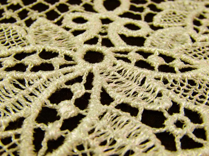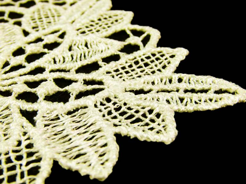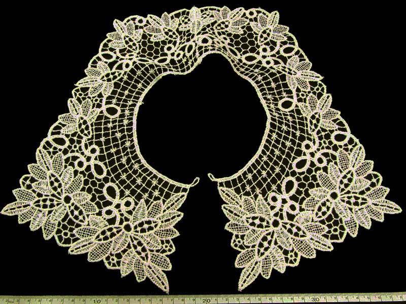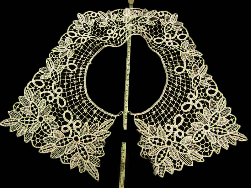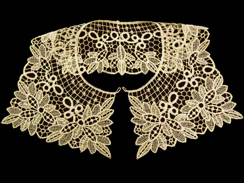 Jednoczęściowy, gipiurowy kołnierzyk o bardzo delikatnej, ażurowej strukturze i błyszczącym wykończeniu. Z przodu możliwość zapinania na guzik.