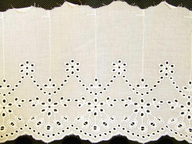 Koronka batystowa haftowana metodą dziureczkową matową nitką bawełnianą.