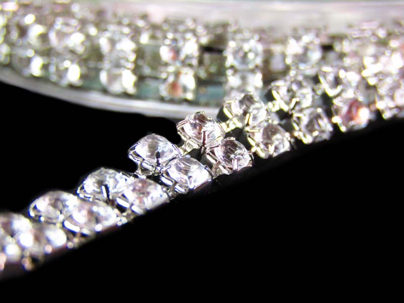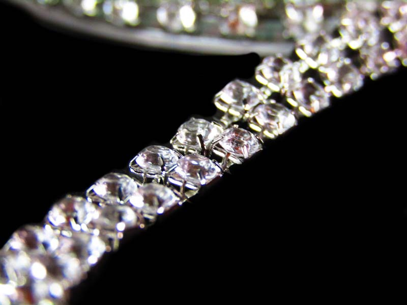 Taśma w formie podwójnego srebrnego łańcuszka z gęsto osadzonymi przejrzystymi cyrkoniami w metalowej oprawie.